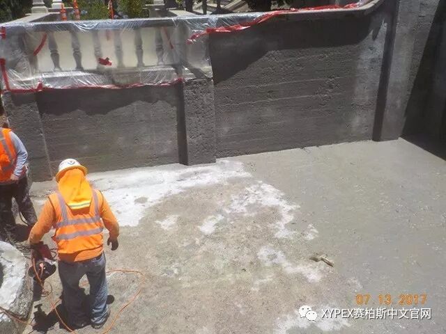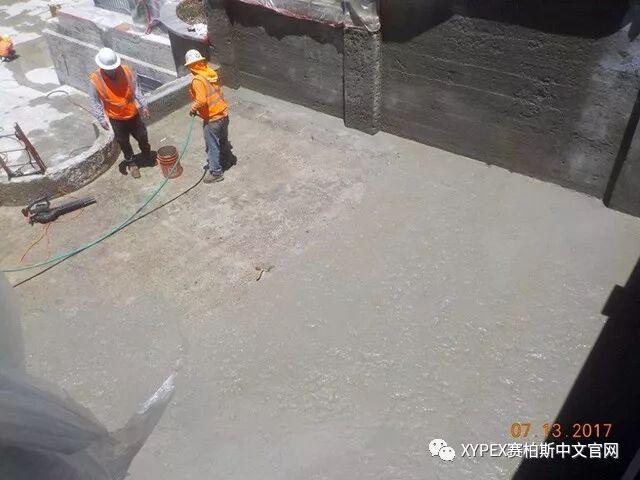 由于施工是在华氏90度(小编:约等于摄氏32度)的天气下进行,因此夜间使用了自动喷淋系统,以防止赛柏斯涂层过早干燥。14天之后,闭水试验开始。当开始注水的时候,能够发现有些地方出现了渗漏现象,但经过几天之后,随着结晶体在混凝土毛细孔和腔道内的不断生长,渗漏开始逐渐减少,直至最终完全消失。当这个过程完成之后,再使用高压水枪将赛柏斯的涂层去除,以便恢复原始瓷砖所需的砂浆层可以直接施工于混凝土基面。